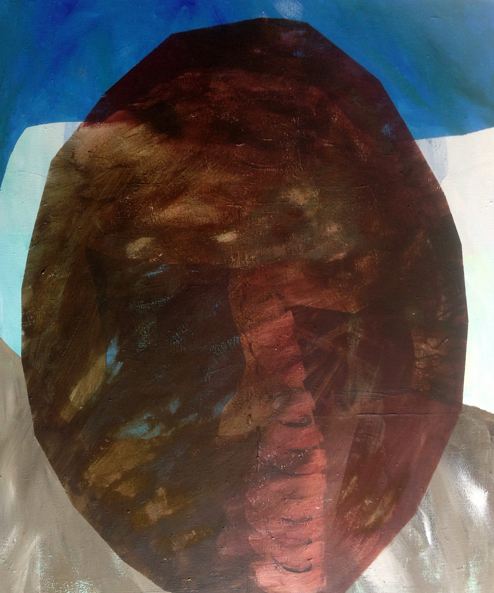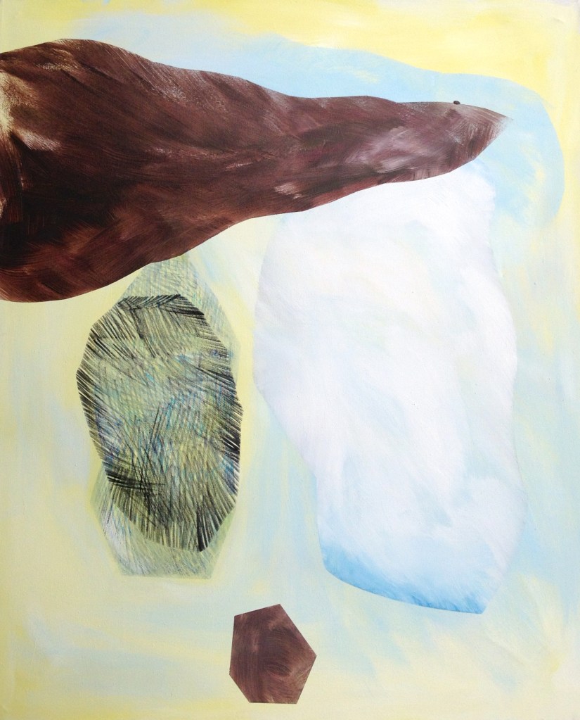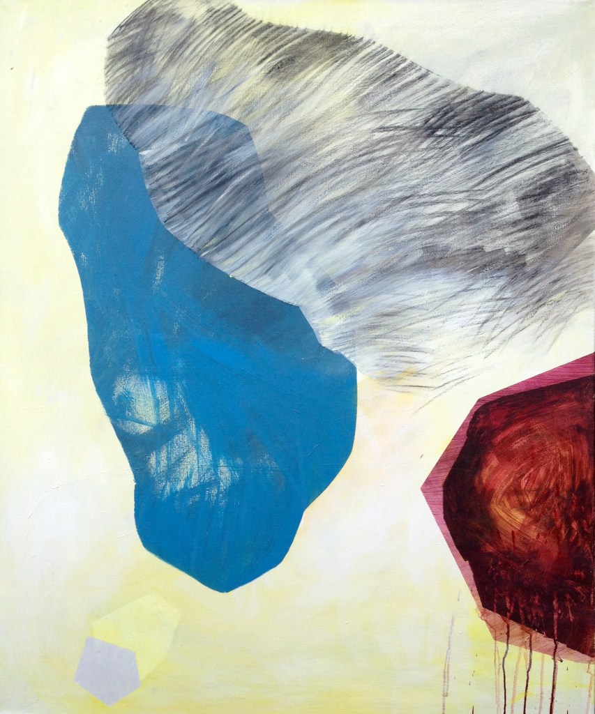 Als ik naar buiten kijk : wolken, zachte luchten, takkenbundels en steen, asfalt of huizen. Geruisloos leeft het naast elkaar, bij elkaar en door elkaar. Door gebruik te maken van sjablonen krijg je een interessant spel tussen vorm en restvorm. Acryl op doek, 115 x 145 cm.