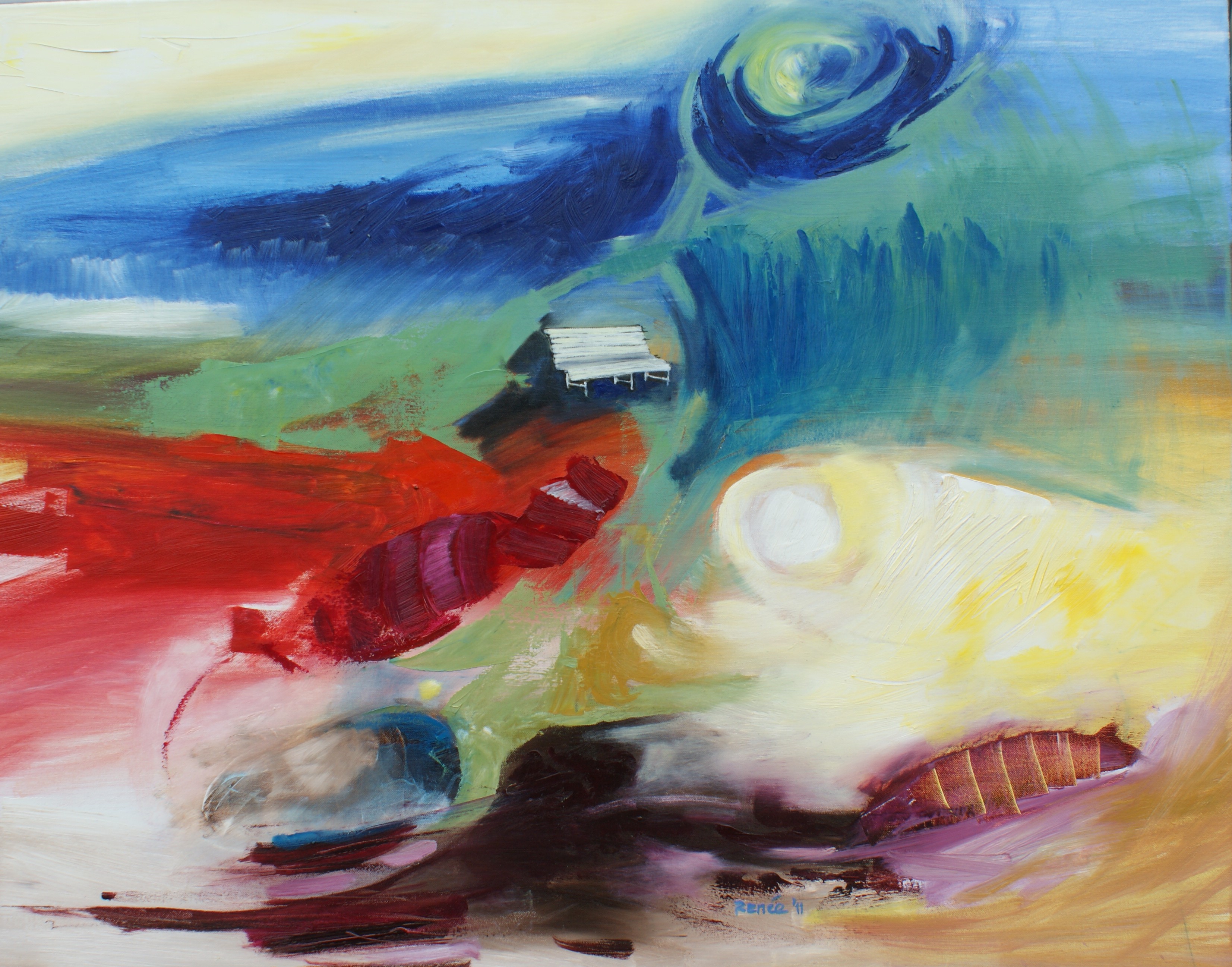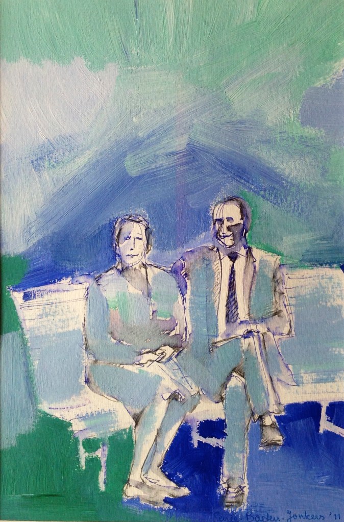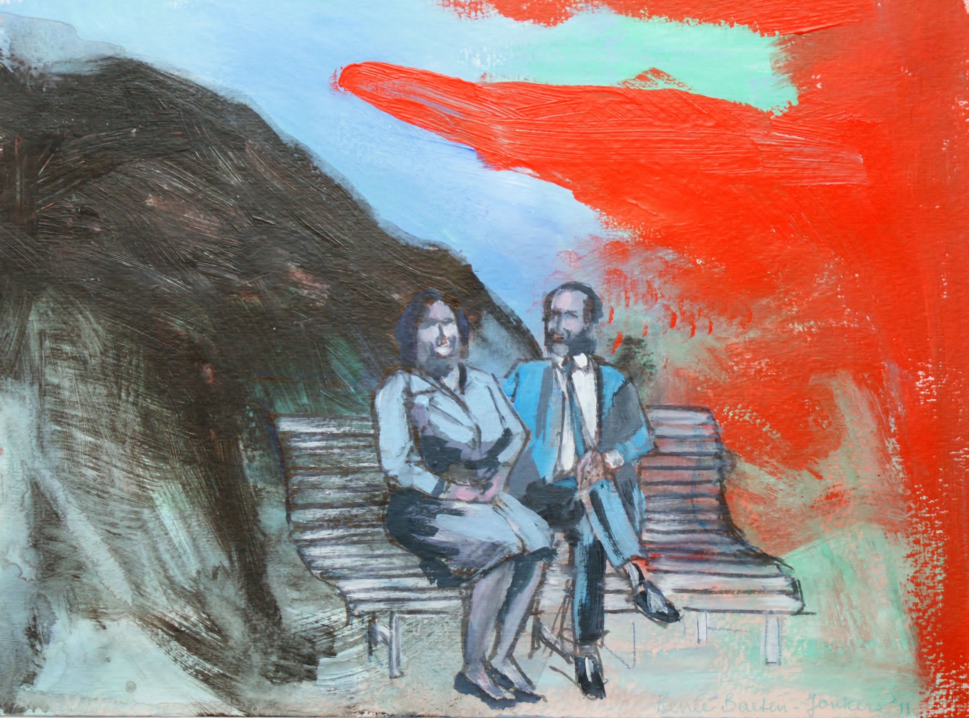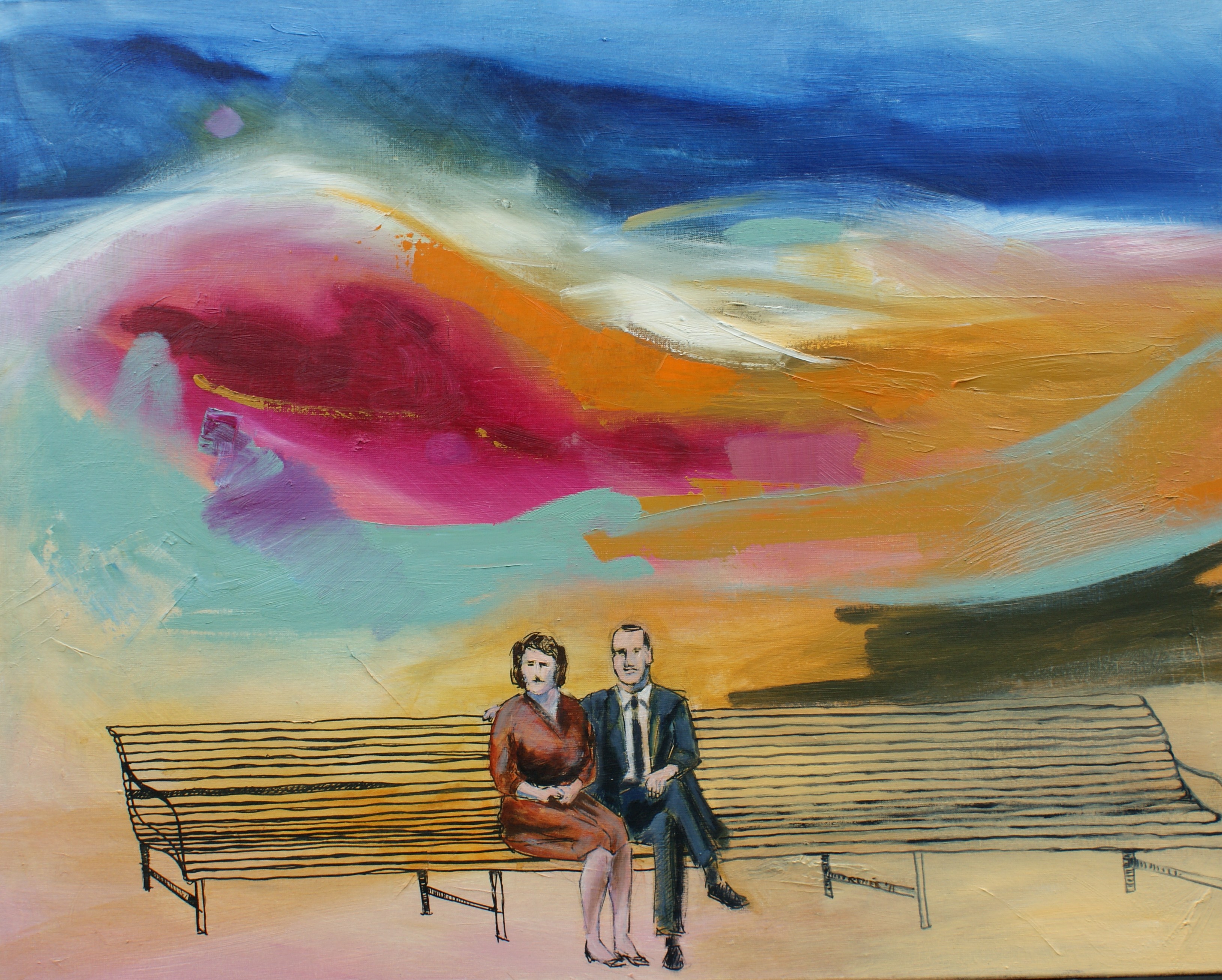 Deze schilderijen zijn gemaakt aan de hand van een oude foto van mijn grootouders op een bankje in hun tuin. Ietwat formeel en ietwat aandoenlijk; het was een feestelijke dag. In de schilderijen ontstaat een verhaal om deze beeltenis heen.