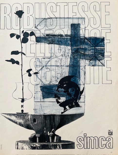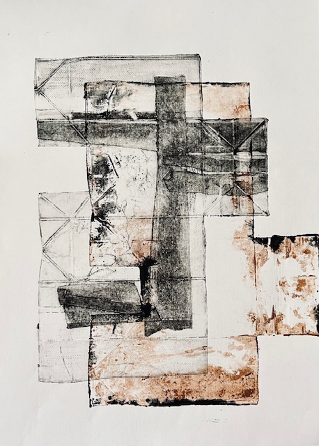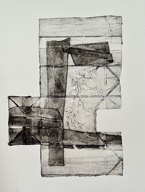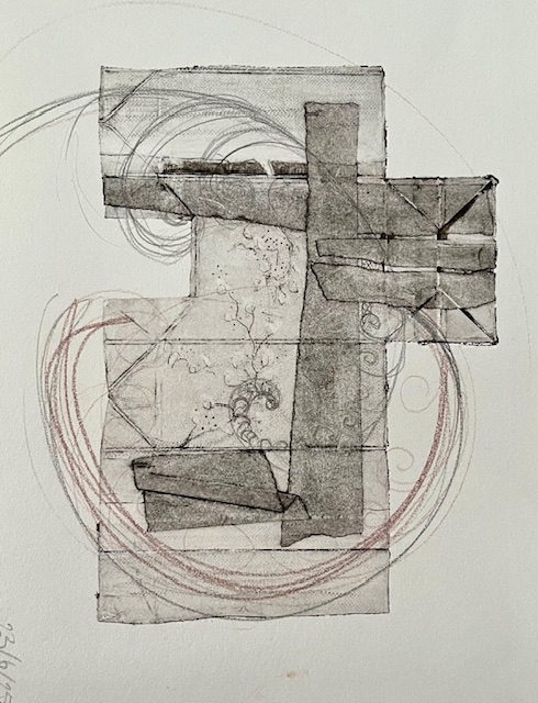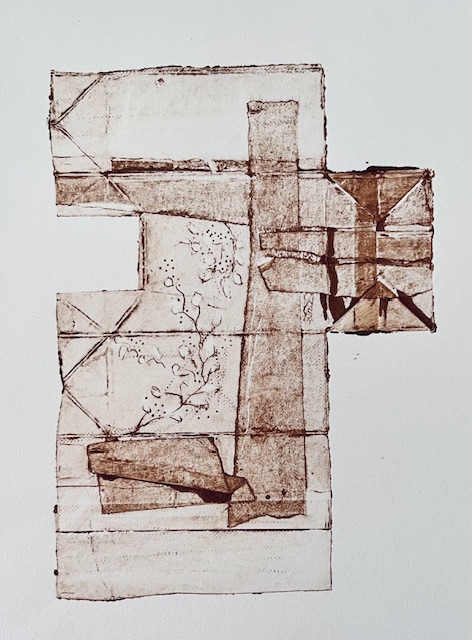 In dezelfde periode heb ik een serie afdrukken gemaakt met een tetra pak. Het is spelenderwijs ontstaan; combinatie van een takje en tape. Bij het afdrukken heb ik combinaties gemaakt van afdrukken en kleuren. A4 formaat. Eén exemplaar is afgedrukt op een pagina van een oud Frans weekblad.