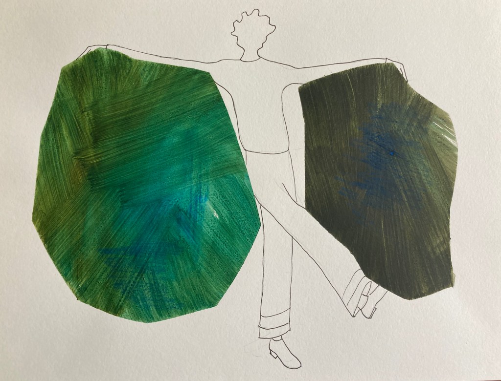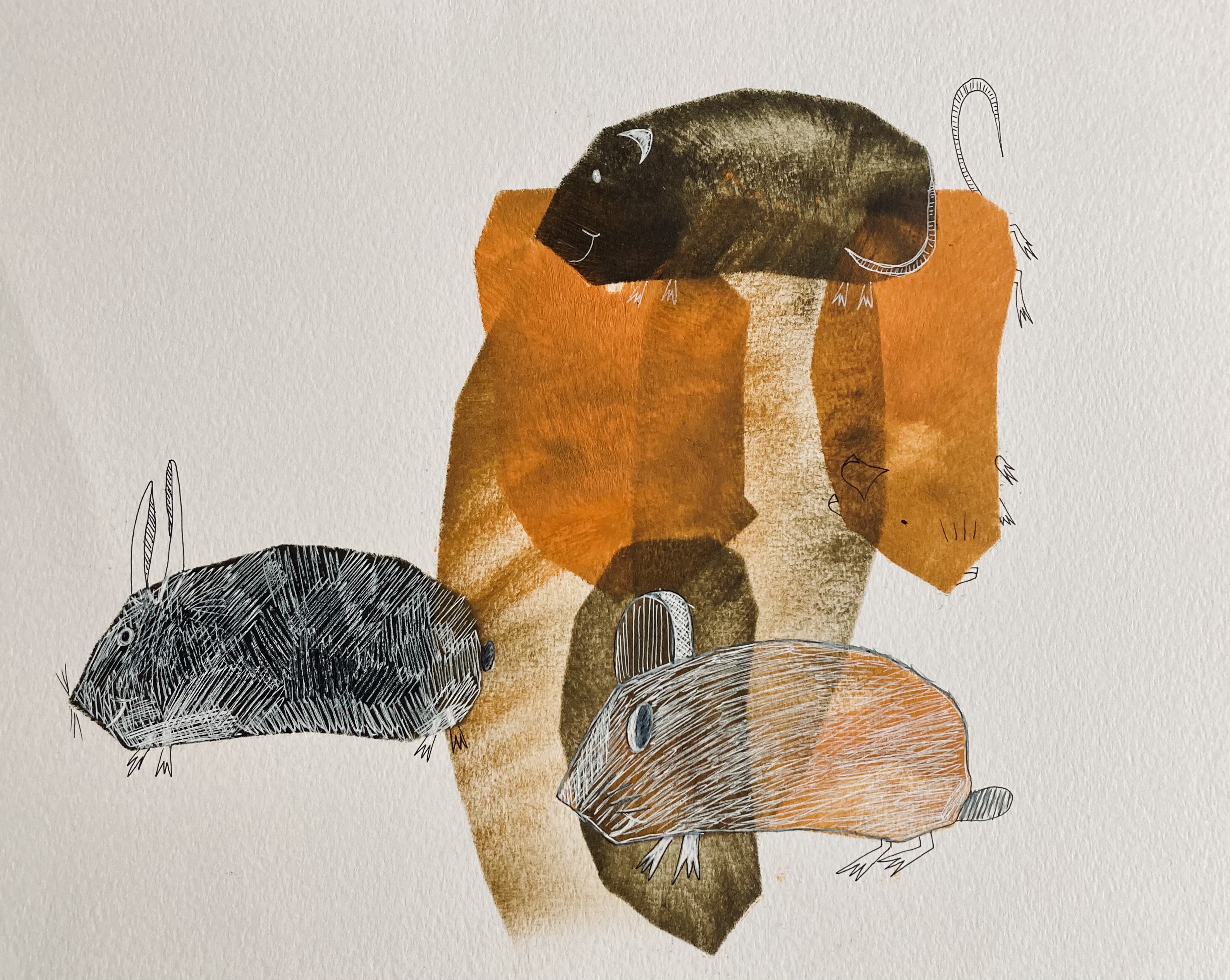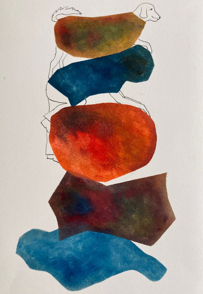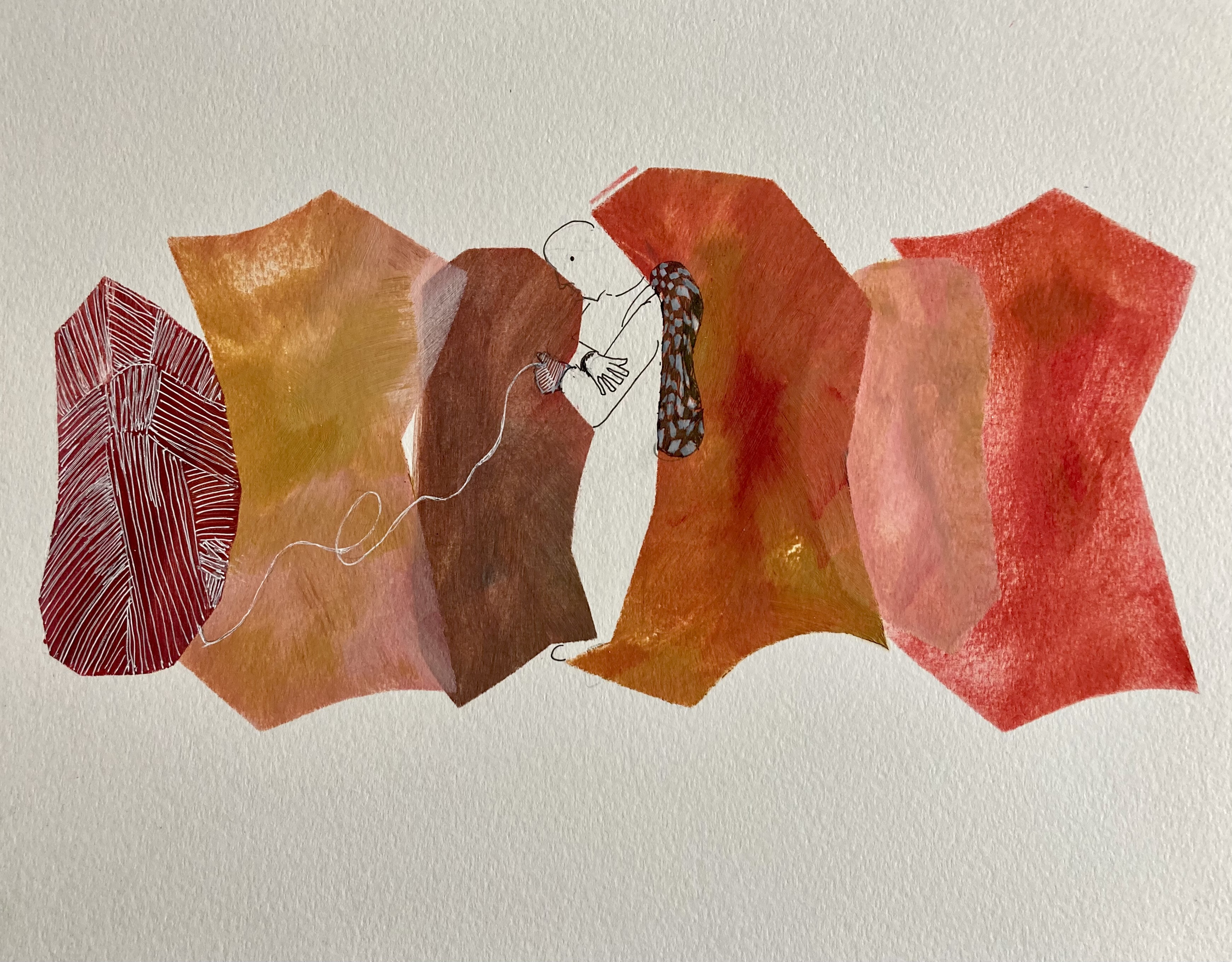 Geïnspireerd door mijn ‘Werk op papier’, met een samenspel van gesloten organische vormen, ontstond ook een conversatie met en tussen mens en dierfiguren op, in en tussen de vormen.